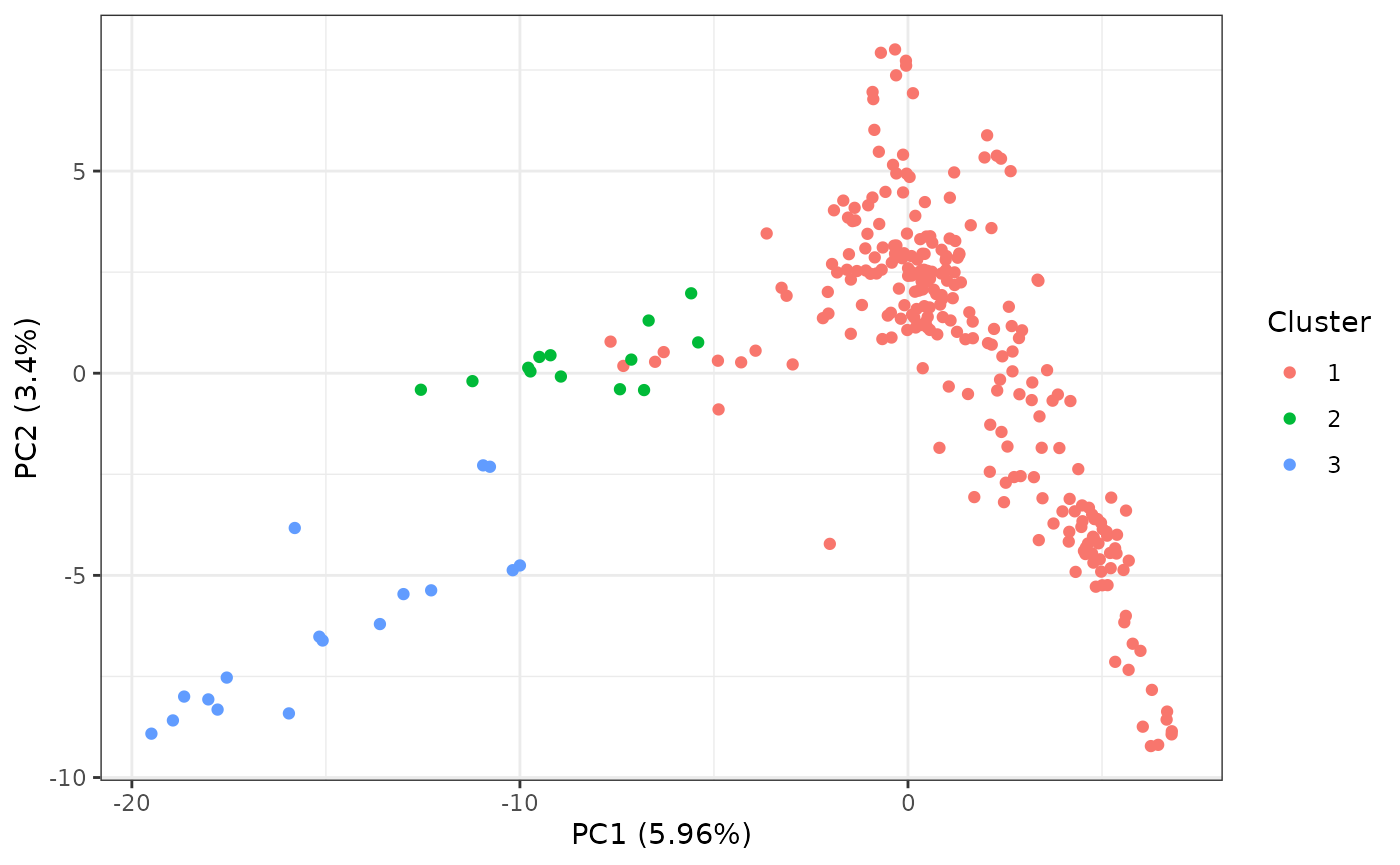 pcaRes |> plotPCA(cluster = TRUE, nClust = 3)