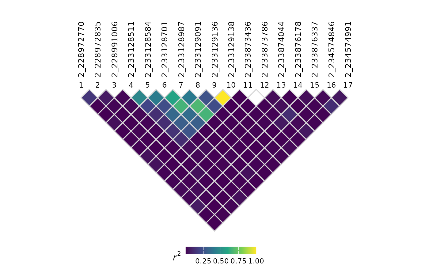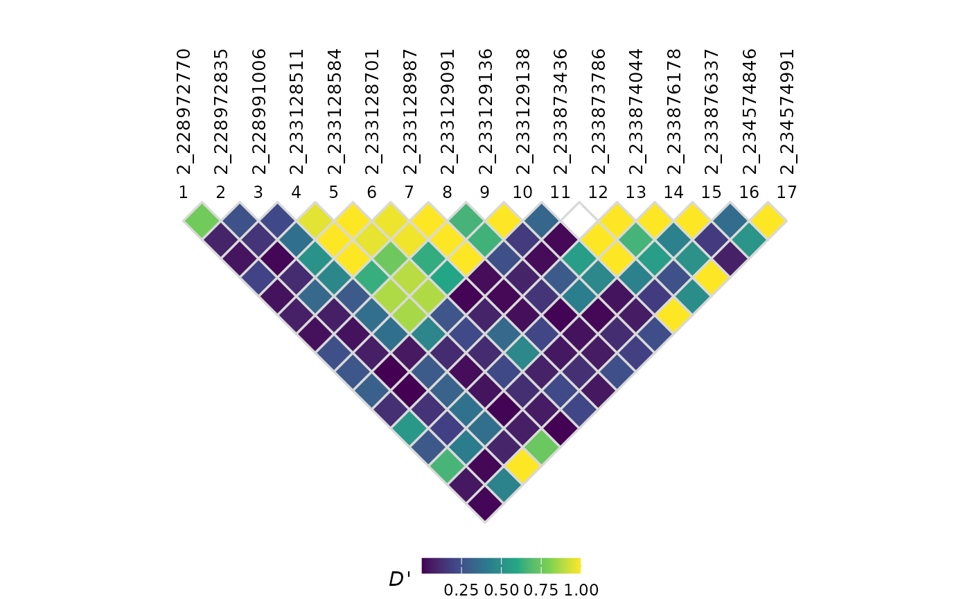 ## # Frequency2 <chr>, Dist_bp <int>, `R^2` <dbl>, DPrime <dbl>, pDiseq <dbl>,